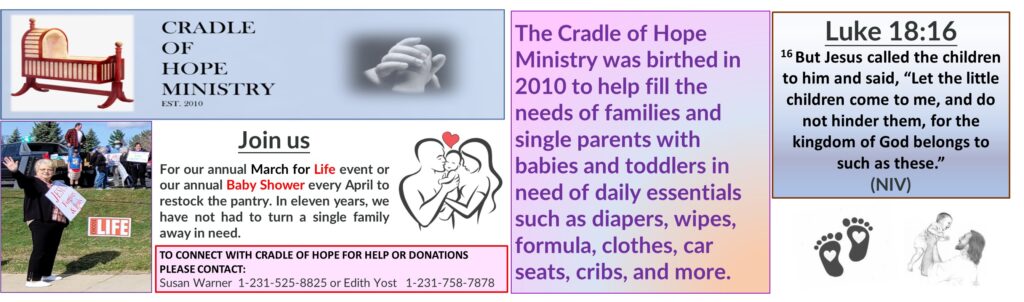 The Cradle of Hope Ministry was birthed in 2010 to help fill the needs of families and single parents with babies and toddlers in need of daily essentials such as diapers, wipes, formula, clothes, car seats, cribs, and more. I was made aware of these needs as I worked each week at the local Helping Hands Food pantry.